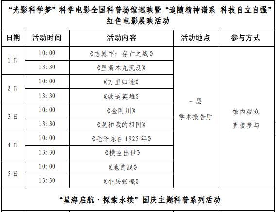 任务一:“光影科学梦”科学电影全国科普场馆巡映暨“追随精神谱系 科技自立自强”红色电影展映活动