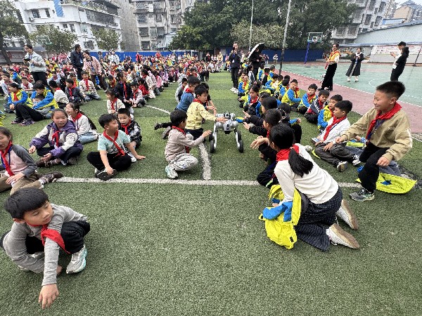 活动中,人工智能科普秀格外吸睛。由GO2四足机器狗、Go2‑W轮式机器狗及G1人形机器人共同组成专业机器人科普团队,通过科技辅导员精心编排的互动表演与科普讲解,生动展示前沿智能科技,让同学们近距离感受人工智能的独特魅力,沉浸式体验科技带来的趣味与震撼。