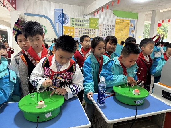 科普大篷车还搭载数学、电磁、机械传动等互动微型展品,打造“流动科技馆”,让少数民族地区学生也能轻松体验科普乐趣。其中反应测试、手不能抖等趣味互动展品挑战人气高涨,同学们亲手操作实验器材,在玩乐中学习专注力训练相关科学知识,提升动手实践能力。