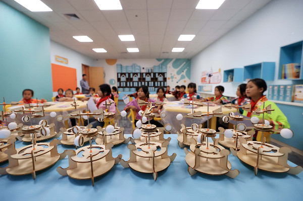 10月15日,在柳州科技馆,少数民族学生在学习制作风向标。